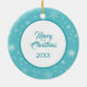 Na frente deste ornamento de Feriado está um belo retrato de aquarela de um cão Schnauzer cinza dentro de um quadro sagrado e verde de tosse. Morangos vermelhos e cones de pínus decoram os sprigs de pinho e sprigs de pinho. A imagem é colocada em um círculo branco formado por um padrão retroazul de floco de neve. A parte de trás do ornamento tem o mesmo plano de fundo e círculo com seu texto personalizado em azul sobre um fundo branco.