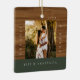 Celebrate your engagement with this elegant mid-century modern ornament, featuring a stylish faux brown wood and white two-tone design. A bold dark olive green stripe along the bottom highlights the couple’s name, while a minimalist square frame displays your favorite engagement photo. With one photo on each side, this ornament is a beautiful double-sided keepsake. The phrase “Engaged & Merry”, the year, and your names are displayed in a clean, modern font around the image – perfect for adding a personal touch to your holiday decor or gifting to a newly engaged couple. Design and Layout by ©Moodthology Papery