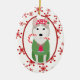 Na frente deste ornamento de Feriado está um lindo cão Siberiano Husky vestindo um Papai Noel vermelho e branco, um suéter verde, e um sino vermelho. Ele carregar uma bengala listrada na boca. A imagem é colocada sobre um oval branco moldado por um padrão retrovermelho de floco de neve. A parte de trás do ornamento tem o mesmo plano de fundo e oval com o seu texto personalizado em dois campos. Bonita! *Obrigados para Compro de estação de presentes para a imagem do cão neste design.