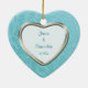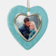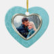 Este ornamento de guarda de férias mostra sua própria fotografia dentro de uma bonito estrutura azul-cerulana de escada brocada que tem um revestimento de prata dentro. O outro lado tem a mesma borda azul do céu com texto adicional no interior azul da cinza. Um presente elegante e festivo para recém-casados, qualquer casal, ou para qualquer fotografia de retrato. Para posicionar sua foto para a melhor aparência depois que ela for carregada, use "Personalizar", os indicadores de seta e mais ou menos para dimensioná-la. *Observe que a imagem é impressa na superfície e não contém tecido brocade ou metal.*