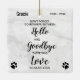 Honre seu melhor amigo com um ornamento memorial personalizado. Este enfeite de manutenção é o presente perfeito para você, família ou amigos para prestar tributo ao seu amado. Esperamos que seu memorial traga paz, alegria e memórias felizes. "Não se esqueça, em algum lugar entre Alô e Adeus, havia amor, tanto amor. ." Personalizar com nome e datas. O ornamento é duplo, ambos os lados são idênticos. COPYRIGHT © 2020 Judy Burrows, Black Dog Art - Todos os direitos reservados