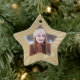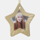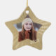 A frente deste ornamento em forma de estrela segura a foto do seu graduado em uma moldura que combina com a forma do ornamento. O ano de graduação está em dourado claro no canto inferior direito da foto, e tudo está emoldurado em um fundo com um padrão dourado brilhante. A parte de trás do ornamento tem o mesmo padrão dourado, com a estrela branca central contendo seu texto personalizado em dourado mais escuro. Uma bela lembrança para qualquer graduado!