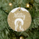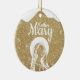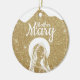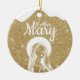 Mother Mary, Religious Holiday Ceramic Ornament with snow top gold glitter capturing the Christmas magic and joy of a Christian season. On the back, a shortened (to fit and stay uniform) sacred writing, Matthew 1:18 from the King James Version (KJV) states: "Birth of Jesus Christ: When as his mother Mary was espoused to Joseph, before they came together, she was found with child of the Holy Ghost" all in customizable text, ready for you create your favorite bible verse in festive devotional design hanging decorations. Order your Christ teachings testaments today and make your custom inspirational doctrine keepsakes extra special with divine passages of the word of our Lord! 🎄⛪️