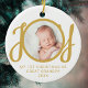 This keepsake "My First Christmas As Great Grandpa" photo ornament is decorated with the word JOY in stylish gold script typography on a white background. Easily customizable, with your baby's photo.