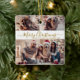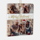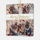 Caligrafia Elegante Simples Moderna Dourada e Colagem de Fotografias Branca 3, Ornament Cerâmico de Natal Feliz. Este festivo, minimalista, cômico, três feriados fotográficos Ornament apresenta uma bonito colagem fotográfica em grade e diz "Feliz Natal"! O texto "Feliz Natal" é escrito em um script de fonte com letras suaves e sujas em ouro, em fundo branco. No verso, uma foto de cheio com o nome da família. Bonito manutenção para sua família e amigos na época de Natal.