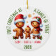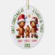 Celebre a alegria do seu primeiro Natal como uma família de três com este adorável ornamento familiar personalizado de pão de gengibre! Apresentando uma mamãe de pão de gengibre, pai e bebê vestindo chapéus festivos de Papai Noel, este ornamento é o nome perfeito para novos pais. Cercado por flocos de neve de pão de gengibre e por um borrão de alegria de férias, este charmoso design parecerá excelente em qualquer árvore de Natal. Personalize o ornamento com os nomes de sua família para torná-lo verdadeiramente exclusivo. Quer seja para a sua própria árvore ou um presente pensativo para os entes queridos, este ornamento do "Primeiro Natal como Família dos Três" certamente trará sorrisos por anos.