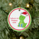 Personalize este Enfeites de natal de dinossauro bebê fofo com o nome do seu filho ou outro texto dentro do círculo verde e vermelho. Enfeite personalizado com um dino em um Papai Noel que guarda um presente de feriado.