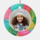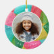 Adicione uma pop de cor divertida à sua árvore de Natal com este Enfeites de natal fotográfico, com um design de papel de tecido de decopagação colorido em vermelho, verde, limão, azul-aqua, rosa e amarelo-ouro. Personalize-o com o nome do seu filho, o ano e as fotos - escolha a mesma foto para a frente e para trás ou escolha duas fotos diferentes.