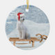 Poodle branco do lado de fora em um fundo de neve e vestindo um chapéu de Papai Noel sentado em um trenó esperando por um Enfeites de natal de amantes de cachorros fofinhos