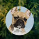 Adorno de natal do bulldog francês inspirado na pop art, apresentando um cão francês fawn vermelho em um fundo azul pastel que pode ser alterado para qualquer cor, adicione o nome do seu animal de estimação.