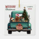 Um caminhão de coleta de retro azul lacrimogêneo carregar uma árvore de Natal decorada e pacotes de presentes neste Enfeites de natal de vidro bonito. Olhar para fora do portão é um lindo cachorro irlandês Setter vestindo um chapéu vermelho e branco do Papai Noel. Um cartaz de madeira rústico na pára-choque diz "Feliz Natal". O texto vermelho e verde estilizado no topo à esquerda diz "MERRY CHRISTMAS", com seu nome (ou do seu cachorro) e o ano à direita. Ambos os lados têm a mesma imagem.