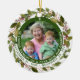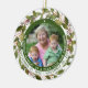 Este lindo ornamento memorial lembra sua mãe com duas fotos, uma na frente, e outra na parte de trás, e datas de sua dentro de natal, com o holly greenery e a citação "Na memória amorosa da minha querida mãe." Também pode ser personalizado para um pai alterando o texto. No topo do ornamento há um pequeno coração branco.