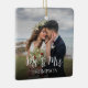 Celebre a temporada de festas com este elegante enfeite de Natal de foto do Senhor e Senhora, apresentando tipografia de letra cursiva simples e uma foto personalizável do casal. Perfeito para casamentos, recém-casados, aniversários ou casais que celebram as festas juntos, este enfeite personalizado cria um enfeite de árvore de Natal atemporal.