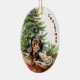 Na frente deste ornamento de Natal está a imagem de um adorável cão preto e bronzeado de Dachshund deitado na sua cama de vime em frente a uma árvore de Natal decorada. O texto vermelho curvo no lado diz "NATAL". No verso, o texto vermelho e verde diz MERRY CHRISTMAS", e há campos de texto adicionais para você personalizar. Faça-o dizer o que quiser!
