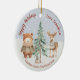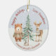Adicione um toque especial à sua árvore de Natal com este enfeite de Natal personalizável que apresenta uma bela ilustração em aquarela de animais da floresta usando cachecóis de inverno aconchegantes, uma árvore de Natal simples, neve caindo e uma tipografia que diz “Boas Festas Com Amor Vovó”, além de um espaço para adicionar o nome, idade e ano do destinatário. Modifique as três áreas de texto para criar um presente especial para o quinto Natal da sua neta que será apreciado por muitos anos.