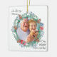 No Enfeites de natal Loving Memory que você pode personalizar com sua própria foto e texto. A design apresenta tipografia de estilo manuscrito e uma coroa de pinho, cheia de verde de inverno, presente, rosas e sagrado. O modelo está configurado para você adicionar sua foto na frente e você pode editar as palavras "da minha amada mãe e pai". No verso, o texto da lembrança "para sempre em nossos corações" é enquadrado com uma coroa correspondente e você pode personalizar isso também.