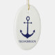 Nome de barco personalizado marinho de âncora náutica azul e branco ornamento cerâmico de Natal. Design elegante minimalista