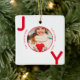 Um Enfeites de natal moderno minimalista em vermelho e branco. Um fundo branco chic, com a palavra JOY escrita com letras vermelho em negrito. A letra O é usada como quadro fotográfico. Personalize e adicione sua própria foto da família, nome e ano.
