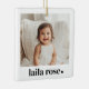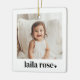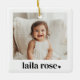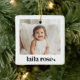 Este ornamento de feriado é perfeito para pais, padrinhos, avós e entes queridos com uma foto do bebê. Este design combina simplicidade moderna com encanto sazonal. Ele apresenta uma foto e o nome do pequeno em um design tipográfico ousado é acompanhado por um coração delicado ao lado.