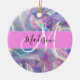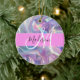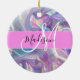 Nome do monograma holográfico, iridescente, roxo e aqua, cor-de-rosa-menina, e ornamento cerâmico inicial. Seu nome personalizado e monograma são escritos em um elegante roteiro escrito à mão com um fundo rosa. Um aniversário perfeito ou presente de Natal!