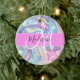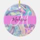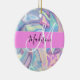 Nome do monograma holográfico iridescente, cor-de-rosa-menina, aqua e turquesa e ornamento cerâmico inicial. Seu nome personalizado e monograma são escritos em um elegante roteiro escrito à mão com um fundo rosa. Um aniversário perfeito ou presente de Natal!