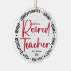 Enfeites de natal de professor aposentado com qualidades de ensino: quente, compassivo, carinho, amável, gentil, leal, confiável, divertido, dedicado. Texto de escrita manual baseado em design a preto e vermelho. Adicione o nome do seu professor e o ano de aposentadoria. Faz o presente perfeito para seu professor favorito celebrar seu primeiro Natal como professor aposentado.