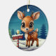 Unique north pole reindeer ceramic ornament featuring a Christmas scene with cute baby forest animal deer with antlers in a cartoon graphic art style, standing in the foreground. Background includes wintry night Xmas trees and white winter snow landscape, completing the holiday season charm of this woodland wildlife doe character illustration decor, making a great gift. Fawn lover design on front and back. No matter how the decoration turns, it always looks festive and complete. 🎄🦌