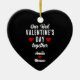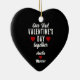 Nosso Primeiro Dia de os namorados Junto Com O Ornamento Cerâmico Do Casal. Um ornamento personalizado com tipografia moderna e moderna dizendo Nosso primeiro Dia de os namorados juntos, 3 corações vermelhos e nomes. Adicione seus nomes e faça um presente adorável para um namorada ou namorado.
