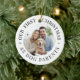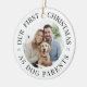 Celebre o primeiro feriado com seu filhote! Este ornamento cerâmico branco redondo apresenta o texto "OUR FIRST CHRISTMAS" acima e "AS DOG PARENTS" abaixo, moldando uma janela de fotos de borda suave para seu retrato favorito de casal e cão. Os números de ano dividido sentam-se perfeitamente nas laterais para uma disposição limpa e equilibrada. A tipografia preto-e-branco a mantém moderna e combina com qualquer árvore ou caixa de presentes. Largue a sua foto e marque o ano para criar uma sã mania para amantes de animais de estimação e novas famílias de cães.