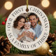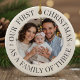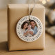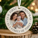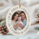 O ornamento moderno de cerâmica branca redonda, com o ARMAZENAMENTO DO NOSSO PRIMEIRO NATAL, curvado COMO UMA FAMÍLIA DE TRÊS TIPOS. Um círculo de pincelada suave enquadra a foto da sua família, e o ano dividido fica bem nas laterais. Limpo, eterno e perfeito para marcar o primeiro feriado com o bebê.