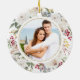 Um belo ornamento de fotos florais do nosso primeiro Natal. Esta design apresenta rosas e bagas em uma coroa de Natal. Uma maneira especial de celebrar seu primeiro Natal juntos como recém-casados.