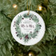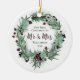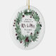 Nosso Primeiro Natal, Sr. & Sra. Primeiro Ornament Foto Cerâmico Casado com verde festivo e coroa de bagas de ameixa na frente e foto de Bride e Groom na parte de trás. Você pode personalizar facilmente seu ornamento muito especial usando a ferramenta design do Zazzle. Por favor, pergunte se precisa de ajuda.