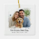 Um ornamento cerâmico quadrado chic com uma janela de fotos de pincel emparelhado e uma legenda "Hitchichado e dobrado" em negrito. Adicione seus nomes e ano abaixo para marcar o momento. A aparência limpa de preto e branco lisa lisonja retratos de casamento ou noivado e pares com qualquer árvore ou plástico de presentes. Perfeito para recém-casados, aniversários, ou um amor romântico para exibir em um stand durante toda a temporada.