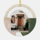 Um enfeite especial para comemorar sua nova casa para as férias. Nossa design na moda moderna e apresenta um design geométrico moderno com formas simples de arco e elementos geométricos concêntricos de ouro falsos. Adicione as suas novas fotografias caseiras exclusivamente enquadradas num design de arco moderno, bem como a sua assinatura familiar e o seu ano. O lado inverso é um design de arco geométrico moderno com um design de semicírculo concêntrico de ouro falso. Design por Moodthology Papery