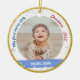 Trendy, elegante e fofo personalizou o Primeiro Ornament de Natal para um novo bebê com uma moldura branca com flocos de neve e estrelas que tem uma abertura redonda para uma foto horizontal personalizada, e banda azul curvada em cada lado na qual aparece o nome ou nomes do menino e sua data de nascimento em uma elegante letra/tipografia. Esta design inclui na frente as palavras "Minha primeira feliz, Natal 202X" com um ouro moderno de falso brilho.