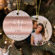 Este Enfeites de natal de fotos monograma faz um presente de manutenção de excelente para os recém-casados. A frente apresenta um fundo rosa dourado gradiente, um quadro úmido brilhante na parte superior e inferior e um monograma elegante de script. Há um modelo de foto fácil de usar no verso. Encontre muitos outros produtos correspondentes na coleção, ou envie-me mensagens através do Zazzle Chat para pedidos especiais e outras formas de cores.