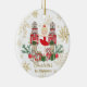 Whimsical The Nutcracker Ballet baby 1st Christmas photo tree ornament. Personalize it with your details easily and quickly, simply press the Edit Using Design Tools button to further re-arrange and format the style and placement of the text. Featuring whimsical characters from the Nutcracker in festive red, green and gold colors. Add your baby's picture at the back of the ornament. Perfect for your little snowflake's first Christmas! Matching items available in store! (c) The Happy Cat Studio.