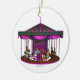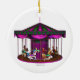 Um carrossel roxo, muito colorido, com feliz-de-volta, bonito, completo com cavalos decorados de madeira de todas as cores e designs que realmente acrescentam um toque de carnaval ou de circo.