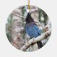 Foto do Jay de um Steller que senta-se em um ramo de árvore coberto na neve durante o inverno. O pássaro azul e preto está no perfil e é cercado por ramos com mais árvores no fundo. Esta foto da natureza de um pássaro no inverno pode ser personalizada e imprimido em muitos produtos diferentes.
