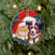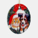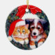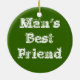 Um gato com uma meia e um cão são centrados em uma grinalda verde neste ornamento e no outro lado estão as palavras: O melhor amigo do homem em um fundo verde.