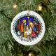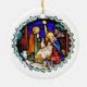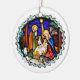 A stained glass window photographic design of the nativity with Mary, Joseph and the infant Jesus.