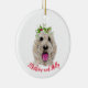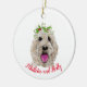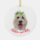 Este é um ornamento personalizável de animais de estimação com um Ouro Doodle vestindo um headdress de Mistletoe e Holly. O texto no verso do ornamento é personalizável para que você possa inserir o nome e o ano do seu Ouro Doodle.