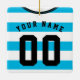 Fácil de editar futebol / futebol / ornamento de festas de camisa esportiva, basta usar as caixas à direita da imagem para inserir sua própria escolha de nome e número. Esta camisola tem um design de colarinho v-pescoço, e linhas azuis claras / padrão de listras. Se você quiser um design personalizado feito em um esquema de cores específico, entre em contato comigo usando o link 'Contate este Designer' abaixo. Ornamentos únicos, personalizados, personalizados, perfeitos para qualquer feriado ou celebração, seja Natal, aniversário, Chanucá, casamento e muitas outras ocasiões! Ideias de presentes de excelente para o fã ou jogador esportivo em sua vida.