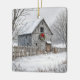Um celeiro rústico é enfeitado com uma coroa festiva de Natal contra um pano de fundo de neve suavemente caindo. O texto pode ser alterado.