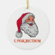Um Papai Noel de sorriso colorido deseja a todos o Feliz Natal no russo.