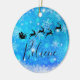 O ornamento temático do Natal com uma silhueta preta de papais noeis cavalgando em seu trenó sendo puxado por sua rena voando pelo céu. Acredite que está escrito em uma fonte de script vermelho de tendência. O fundo é um design de floco de neve gelado azul gelado.