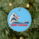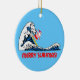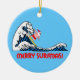 Surfmas alegres! Papai noel surfando engraçado que trava uma onda grande e que deseja lhe o Feliz Natal. Ornamento surfando legal e cómicos dos presentes do Natal do papai noel para decorar a árvore de Natal do feriado.