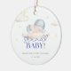 O ornamento cerâmico do chá "Bebê Papai noel" tem um design doce e festivo, com um bebê em um chapéu azul de Papai Noel com nuvens e estrelas moles. Ele usa um roteiro vermelho e tons pastéis, criando uma sensação de feriado aconchegante, perfeita para um chá de fraldas de inverno.
