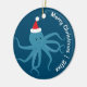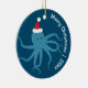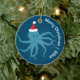 Um Enfeites de natal divertido mostrando um polvo sorridente em um chapéu de Papai Noel em um fundo azul. Este enfeite bonito tem as palavras "Feliz Natal" e um ano personalizável.
