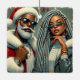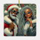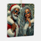 Papais noeis e companheiro estão prontos para comemorar, ambos vestindo roupas temáticas de Natal na moda. Eles estão em um pano de fundo de luzes de férias e decorações, prontos para um encontro festivo.